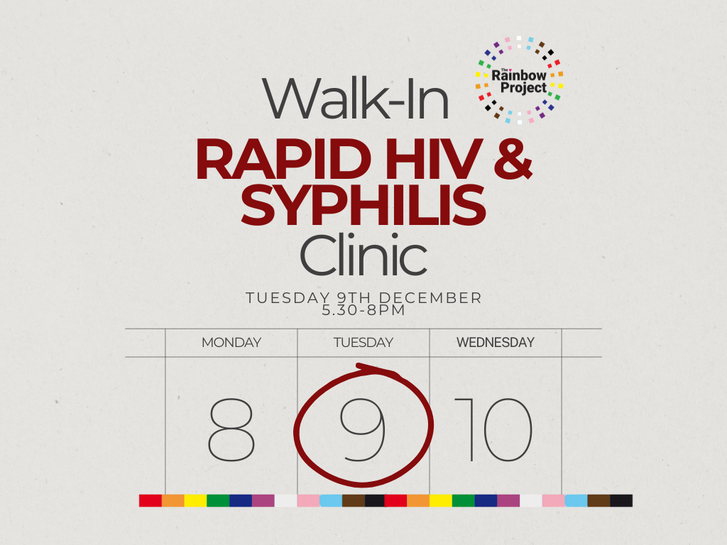 Free, confidential & non-judgemental walk-in rapid HIV & syphilis testing available for LGBTQIA+ people aged 18 or over on Tuesday 11th November 5-8PM at Belfast LGBT Centre. No appointment necessary!